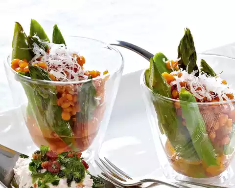 Grate cheese. Heat 2 tablespoons of oil and butter in a large frying pan. Fry the asparagus for 2-3 minutes. Take them out and let them cool down. Arrange asparagus with lentil vinaigrette in 12 small glasses.