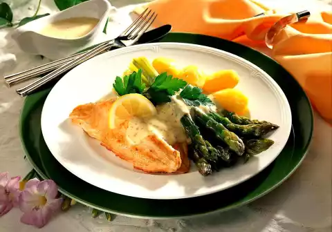 Turn the salmon fillets in the remaining flour. Heat the oil in a pan and fry the fillets on each side until golden brown. Wash the remaining lemon and cut into slices. Arrange asparagus, salmon fillets and mustard sauce on a plate.