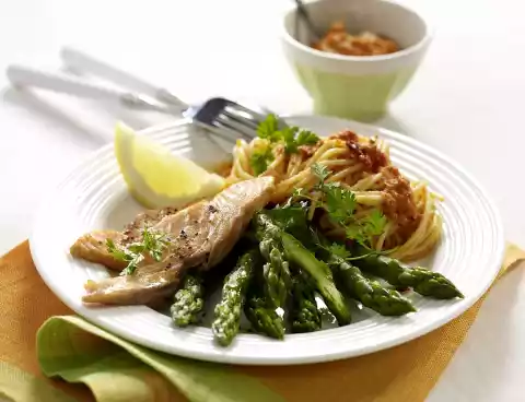 Season to taste with salt, pepper and cayenne pepper. Stir in the remaining tomato cubes. Wash the asparagus, cut off the woody ends. Wash the fish and dab dry. Put asparagus in boiling salted water with sugar and cook for 8-10 minutes.