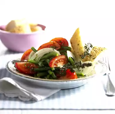 Stir in thyme and mint. Mix with beans, tomatoes and onion. Leave to stand for about 20 minutes. Flavour salad again. Garnish with the rest of the thyme. Flatbread tastes good with it