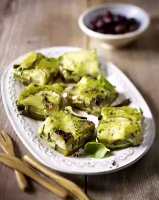 Allow to set in the preheated oven (electric cooker: 150 °C/ circulating air: 125 °C/ gas: level 1) for approx. 20 minutes. Remove the pan from the oven, let it rest for about 5 minutes and cut the frittata into cubes. Arrange on a plate and garnish with basil. Olives taste good with it
