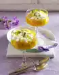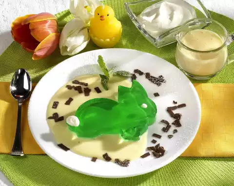 Dip half of the mould with jelly briefly into hot water. Carefully turn over the jelly. Use a cookie cutter to cut out 4 bunnies and place them on 4 plates. Serve with sauce. Spray cream tuffs as eyes and tails. Decorate with mint and chocolate shavings