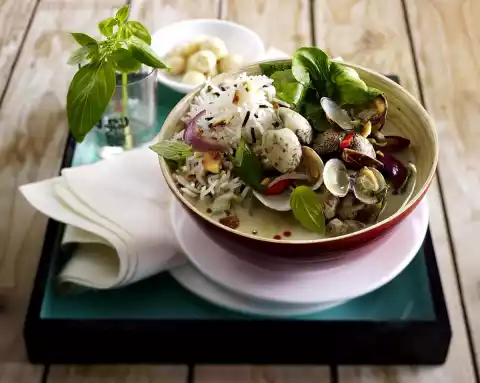 Coarsely chop the macadamia nuts and roast them in a pan without fat until golden brown. Season curry with salt, lime juice and oyster sauce. Drain rice. Arrange curry and rice, sprinkle with macadamia nuts and garnish with basil.