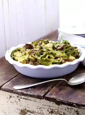 Place in an ovenproof dish and sprinkle with cheese. Spread 40 g butter in flakes on top. Bake in the preheated oven (electric cooker: 200 °C/ convection oven: 175 °C/ gas: level 3) for 15-18 minutes. Remove from the oven, sprinkle with parsley and garnish