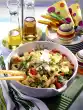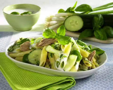 Mix the noodles, cucumber and paprika. Wash basil and shake dry. Pluck half of the leaves from the stalks and cut into fine strips. Add basil strips to the sauce and fold in.