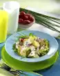 Wash the cucumber, grate dry and slice finely. Clean and wash spring onions and cut into rings. Quarter peppers, remove seeds, wash and cut into bite-sized pieces. Drain the noodles, rinse with cold water and drain.