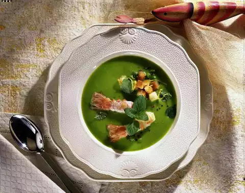 Peel and finely chop the shallots. Sauté in 1 teaspoon of hot fat. Fill up with chicken stock, add peas. Season with salt and pepper. Bring to the boil briefly and puree. Remove the crusts from the toast, cut into small cubes and fry in the remaining hot fat until golden brown.
