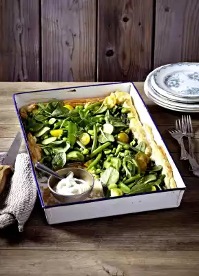 Mix sour cream with about half of the herbs, season with salt and pepper. Mix beans, mangetouts, peas, bean seeds, tomatoes and spinach. Remove the mould from the oven. Sprinkle herbs on the bottom, spread the vegetable mixture on top, garnish with dill and cut into pieces.