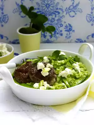 Mix the mangetouts, goat's cream cheese sour cream and spring onions into the finished risotto, heat up again briefly. Serve the risotto and meatballs with the remaining goat's cream cheese and mint leaves