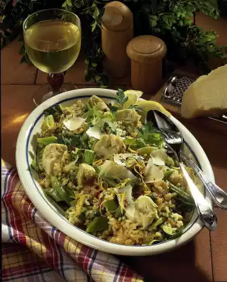 Peel and finely chop the onion and garlic. Fry in hot oil. Add rice and sauté briefly. Season with salt. Add wine and let it swell in a closed pot at low heat. Then add stock little by little. Let it simmer for 20-25 minutes. In the meantime, clean, wash and chop the beans. Cook together in boiling salted water for 8-10 minutes. Drain and rinse with cold water. Cut lettuce into strips, wash and drain well. Drain and chop the artichokes as well. Wash parsley, dab dry and chop. Mix beans, salad, artichokes, parsley, lemon peel and parmesan with the cooked rice. Season if necessary. Sprinkle the risotto with parmesan shavings and grated lemon if you like