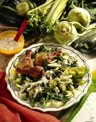 Clean and wash zucchini and celery and cut into thin slices. Clean salad, cut into bite-sized pieces and wash. Drain. Pour sesame sauce over the salad. Arrange chicken drumsticks on top. Serve the rest of the sauce extra
