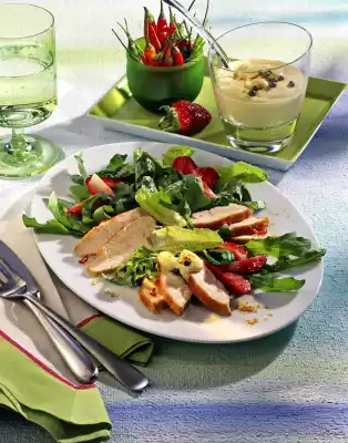 Fry the chicken fillets for about 15 minutes while turning. Season with salt and pepper. Shortly before the end of the cooking time add chilli and garlic and fry briefly. Cut the chicken filets into thin slices. Distribute salad and strawberries on plates, arrange chicken slices on top. Add mango dressing