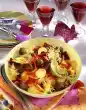 Clean, wash and drain the salads. Cut romaine lettuce into strips. Leave lettuce leaves whole or cut in half, depending on size. Clean, wash and cut spring onions into fine rings. Cut toast bread into small cubes. Heat the fat in a pan and fry the bread cubes until golden brown. Take them out of the pan and let them cool down.