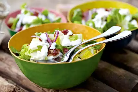 Clean, wash and shake the salad dry, cut in half lengthwise and cut into strips. Peel onions and cut into fine strips. For the dressing, mix sour cream, mayonnaise, lemon juice and half parmesan.