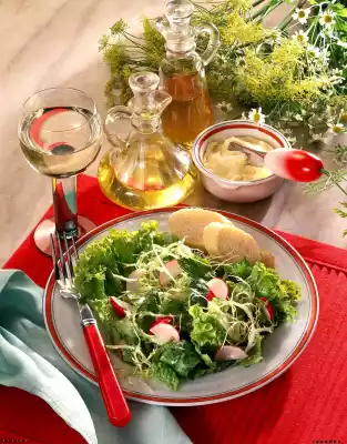 Clean, wash and cut the salad into bite-sized pieces. Clean, wash and quarter the radishes. Mix vinegar, salt and pepper. Whip the oil into it. Mix the salad ingredients with the marinade and leave to stand.