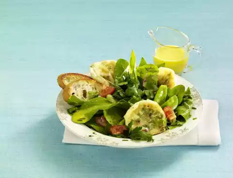 Preparation: Select the herbs, wash and remove coarse stems. Drain herbs thoroughly. Pluck thyme roughly. Cut 3 stems of chives into small rolls. Wash mangetouts.