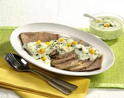 Wash herbs, dab dry and chop except for something to garnish. Mix sour cream, yoghurt, mustard, oil and lemon juice. Stir in the herbs and eggs, up to one tablespoon each, and season with salt and pepper. Lift the finished boiled beef from the stock and cut into thin slices. Arrange on a plate with the green sauce. Sprinkle with the remaining eggs and herbs and serve garnished with parsley and dill