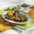 Wash the meat and let it drip off. Peel onion and lard with bay leaf and cloves. Clean, wash and roughly cut soup vegetables into pieces. Boil up two to 2 1/2 litres of water, some salt, onion, peppercorns and soup vegetables in a large pot. Add the meat and simmer covered over a medium heat for two hours. In the meantime, place eggs in boiling water and boil hard for ten minutes. Rinse eggs under cold water, peel and cut into large pieces.