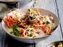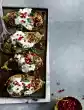Remove the meat from the pan, turn it in linseed and cut it into slices. Cut cress from the bed. Cut the eggs into slices. Spread green spelt in 4 bowls. Place meat, carrots, spinach, eggs and cress on top. Serve immediately.