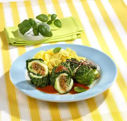 Meanwhile quarter the mozzarella leaves. Place a mozzarella slice on each savoy cabbage leaf. Place 1 heaped tablespoon of the green spelt mixture on top. Wrap the sides of the savoy cabbage leaf and roll into a roulade.