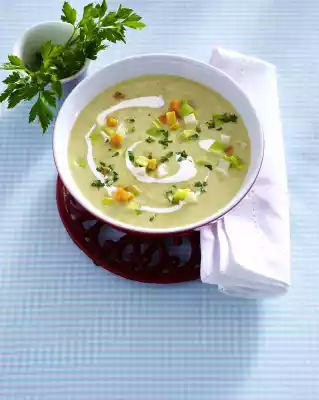Stir the crème légère and milk until smooth. Puree the soup and season to taste with salt, pepper and a little nutmeg. Arrange the soup in a deep plate and garnish with crème légère. Sprinkle with vegetable cubes and parsley