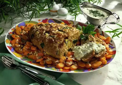 Roast the sunflower seeds briefly, add the carrots and toss in. Arrange carrot vegetables, green spelt roast and some sauce on a plate. Garnish with the remaining parsley and serve with the rest of the sauce.