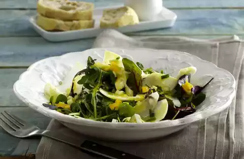 Wash the salad thoroughly and spin dry with a salad spinner. Peel and cut the kohlrabi into thirds and thin slices. Carefully mix kohlrabi and salad, arrange on plates and drizzle with dressing.