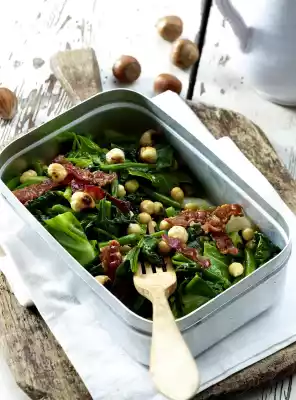 Season vinegar with sugar, salt and pepper. Stir in 2 tablespoons of oil drop by drop. Mix blanched vegetables, chickpeas, hazelnuts, bacon and vinaigrette and pour into a lunch box.