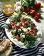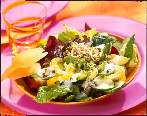 Remove, rinse in cold water and drain. Clean and wash salads and chicory, pluck into bite-sized pieces and drain. Wash and clean the cucumber and cut into thin slices. Halve, clean, wash and cut the bell peppers into thin strips. Remove the rosemary sprig from the dressing. Mix salads, chicory, mangetouts, cucumber, bell peppers and salad dressing. Arrange on plates and sprinkle with the sprouts