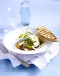 Peel and roughly chop the onion and garlic. Finely mix egg yolk, mustard, garlic, onion and vinegar in the universal chopper or with the hand blender. Add oil slowly. Add yoghurt. Season to taste with salt, cayenne pepper and sugar. Add rosemary and green pepper and leave to stand for about 1/2 hour. In the meantime, clean and wash the mangetouts and blanch them briefly in boiling salted water.