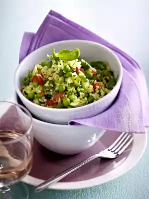 Wash the herbs, shake dry and cut the leaves into small pieces. Mix bulgur, peas, paprika, tomatoes, spring onions and herbs. Season again with salt, pepper and possibly lemon juice. Garnish Taboulé with basil