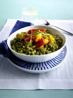 Noodles should have a creamy consistency and be cooked. As soon as they are ready, season with salt, pepper and a little lemon juice. Arrange the noodles and peppers and garnish with lemon zests and thyme