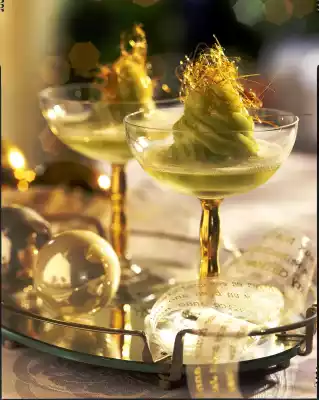 Stir in 2-3 tablespoons of sugar and possibly some food colouring. Leave tea in the freezer for at least 4 hours, stirring occasionally. To decorate, caramelise the remaining sugar until golden brown. Leave to cool slightly while stirring. Dip 2 wooden spoons into the caramel, press them together and pull them apart again and again so that thin caramel threads are formed. Carefully remove the threads from the spoon and place them on some baking paper. Repeat the process. Let the sorbet thaw slightly before serving and puree it with a chopping stick. Pour into a piping bag with a large star-shaped spout and squirt into 4 champagne bowls.