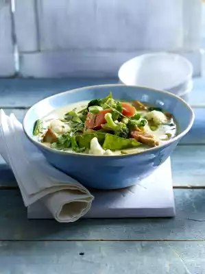 Add 200 ml water and coconut milk, bring to the boil and stir in the stock. Add vegetables and cook everything for about 5 minutes.