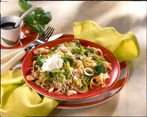 Remove and put aside. Brush the pan with oil and fry the mushrooms and leek for 1-2 minutes. Season with salt and pepper. Add broccoli and rice and fry for about 5 more minutes. Arrange vegetable rice on plates and sprinkle with sesame seeds. Sprinkle each with 1 tablespoon of soy sauce and add 1 tablespoon of sour cream