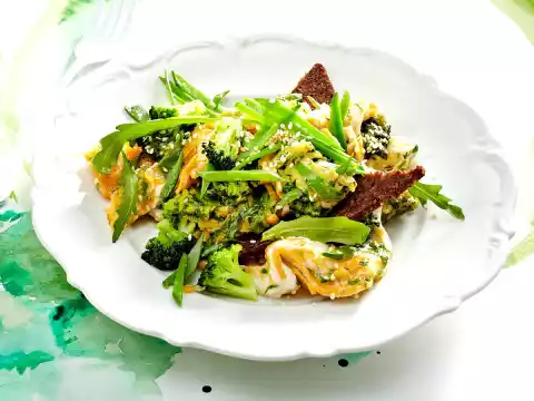 Clean and wash the broccoli and cut it into small florets. Wash, clean and cut the mangetouts into strips. Wash and clean the rocket, drain well and chop finely, except for something to garnish. Wash parsley, shake dry. Pluck off leaves and chop finely. Whisk eggs with rocket and parsley. Season with salt and nutmeg