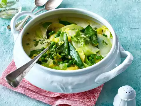 Add the pointed cabbage, mangetout and peas to the soup, bring to the boil again and simmer covered for 6-8 minutes. Wash the chervil, shake dry and pluck off the leaves.