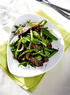 Dab meat dry and cut into strips. Peel and grate ginger. Mix the meat, ginger, soy sauce and 2 tbsp. oil and cover and chill for approx. 30 minutes. Roast sesame seeds in a pan without fat, remove