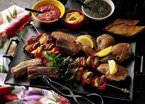 Drizzle with remaining olive oil. Sprinkle with salt and rosemary. Grill ribs on the hot grill, turning occasionally, for about 20 minutes. Grill the stuffed escalopes for about 12 minutes, skewers for about 8 minutes. Then arrange them garnished with lemon wedges and parsley. Serve with mustard, relish, Mexican grill sauce and fresh garlic baguette
