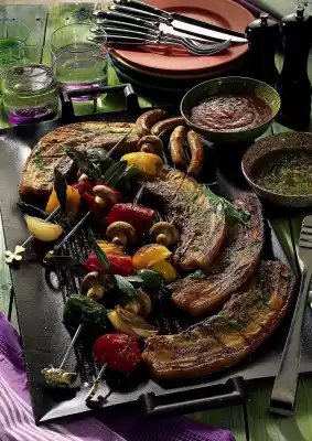 Clean, wash and cut the peppers into bite-sized pieces. Onions peel, halve. Clean and wash the mushrooms. Put prepared vegetables and bay leaves alternately on 8 skewers.
