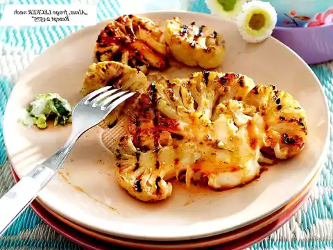 Carefully place the cauliflower on the hot grill or in aluminium bowls. Grill for 5-7 minutes on each side. With avocado and mint remoulade anri