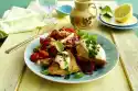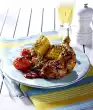 Remove meat from the marinade, grill on the hot grill for 2-3 minutes on each side, place in aluminium bowls, cover and cook for about 10 minutes. Season salad again. Serve meat and salad together
