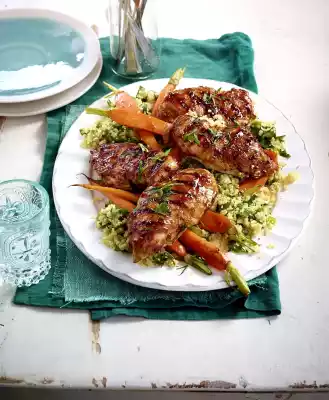 Clean the carrots, leave a little green, wash and possibly cut in half lengthwise. Dab the meat dry. Heat 2 tablespoons of oil in a grill pan and fry the meat for 6-7 minutes on each side. Then season with salt and pepper and brush with sauce.