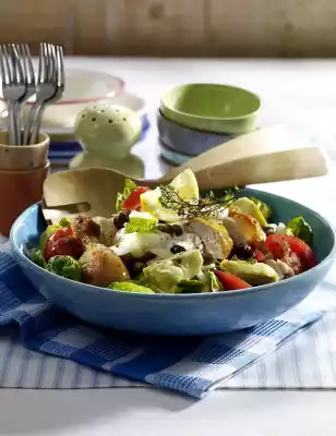 Stir in yoghurt and season to taste with salt, pepper, sugar and lemon juice. Wash the thyme and pluck the leaves from the stalks, except for a little to garnish. Carefully mix the chicken, tomatoes, artichokes, olives, thyme leaves and salad.