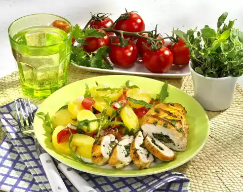 Fill the chicken fillets with the herbs and put them on a wooden skewer. Drain potatoes, quench, peel and let cool. Grill the chicken fillets in a preheated grill for 12-15 minutes. Turn from time to time. Season with salt and pepper. Wash and clean the tomatoes and cut them into pieces. Clean and wash the rocket. Cut potatoes into slices. Heat the stock. Add vinegar and oil and pour over the potatoes.