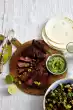 Arrange sauces and vegetables. Sprinkle some pepper on the cheese dip. Cut the meat into slices and add some chimichurri. Crumble the bacon slightly, sprinkle on steaks.