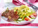 Grill the meat on the hot grill for about 3 minutes on each side. After about 3 minutes add tomatoes and spring onions. Grill briefly while turning. Remove vegetables and meat from the grill. Wrap steaks in foil and let them rest for about 2 minutes.