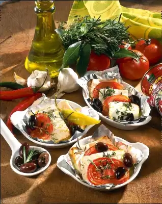 Cut the aluminium foil into pieces and bend the edges up slightly. Put sheep's cheese and tomatoes in alternation. Sprinkle with olives, herbs and pepper and drizzle with olive oil. Cook on the preheated grill for 20-30 minutes.