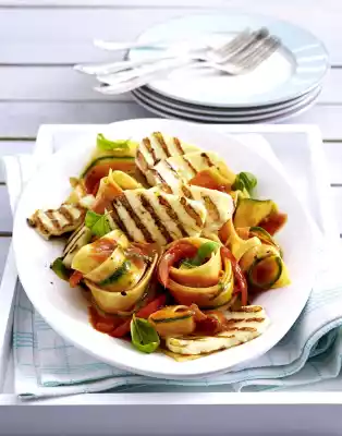 After about 2 minutes add the zucchini and tomatoes. Brush the grill pan with oil and fry the cheese in portions while turning for approx. 4 minutes. In the meantime drain the pasta. Add pasta and basil to the sauce and mix well.