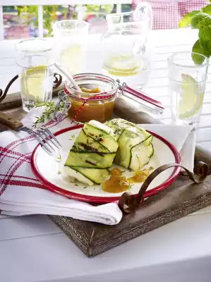 Brush aluminium foil well with oil, place on the grill and place wrapped cheese on top. Grill the cheese for about 15 minutes while turning it over until the zucchini takes on colour and the cheese is soft